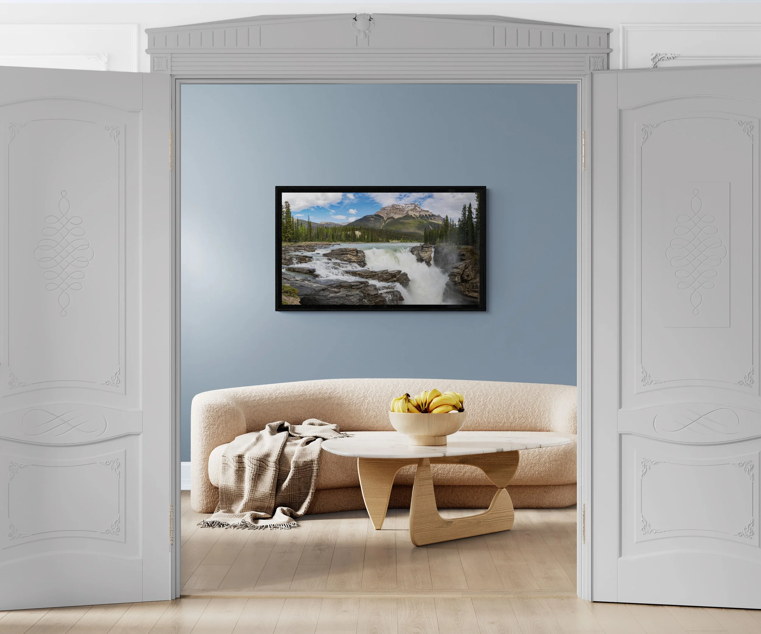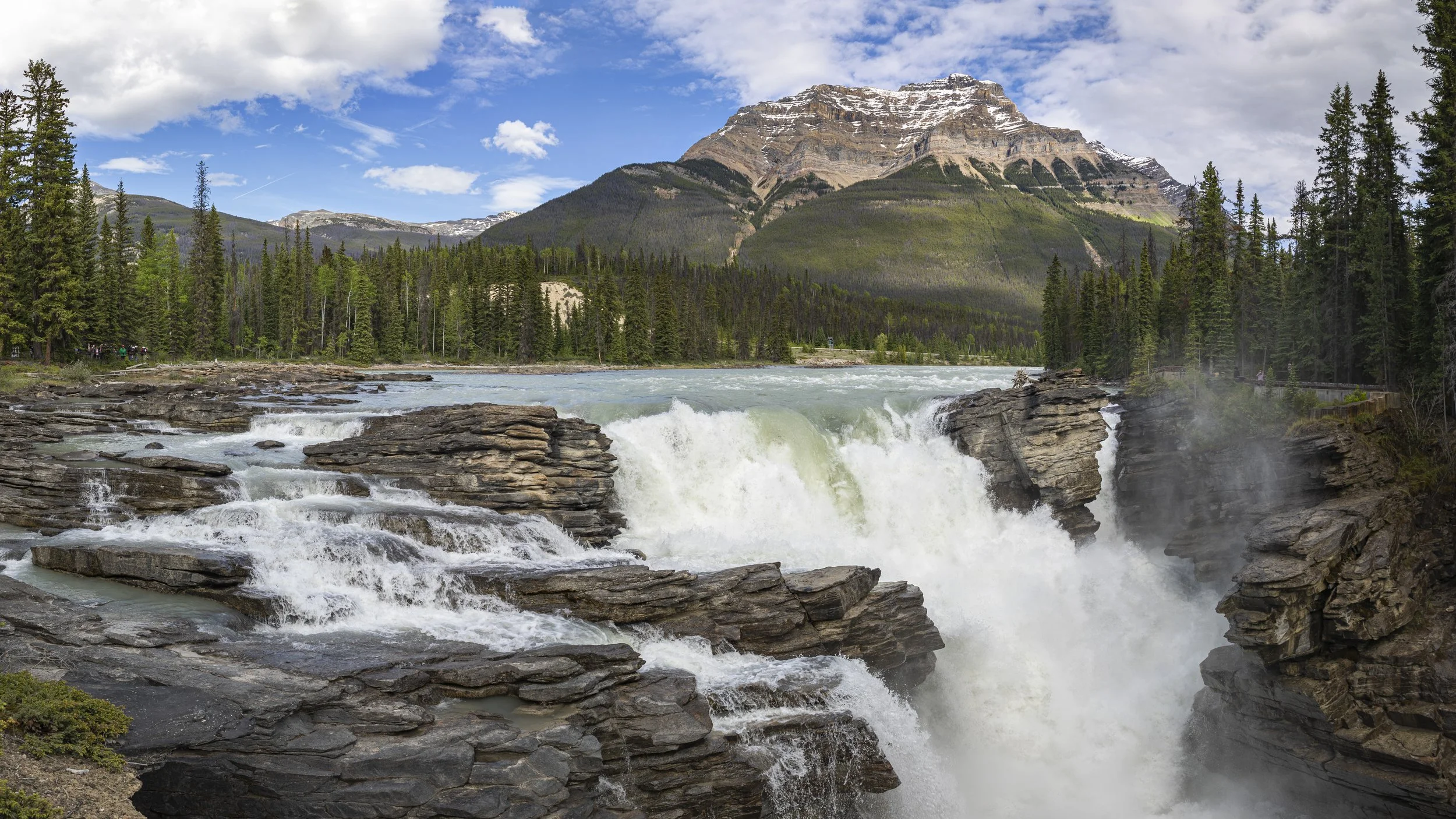 Athabasca Falls is a waterfall in Jasper National Park on the upper Athabasca River, approximately 30 kilometres south of the townsite of Jasper, Alberta, Canada, and just west of the Icefields Parkway. It is classified as a Class 5 waterfall, with a total drop height of 79 ft and a width of 151 ft. Known for its powerful and picturesque nature, Athabasca Falls is not primarily recognized for its height but for its force, attributed to the significant volume of water cascading into the gorge. This force can be substantial even on cold fall mornings when river levels are at their lowest. The river flows over a layer of hard quartzite and through the softer limestone below, creating a short gorge and several potholes. Visitors can safely view and photograph the falls from various viewing platforms and walking trails in the vicinity. Whitewater rafting often commences below the falls, offering an exhilarating journey downstream on the Athabasca River to Jasper.