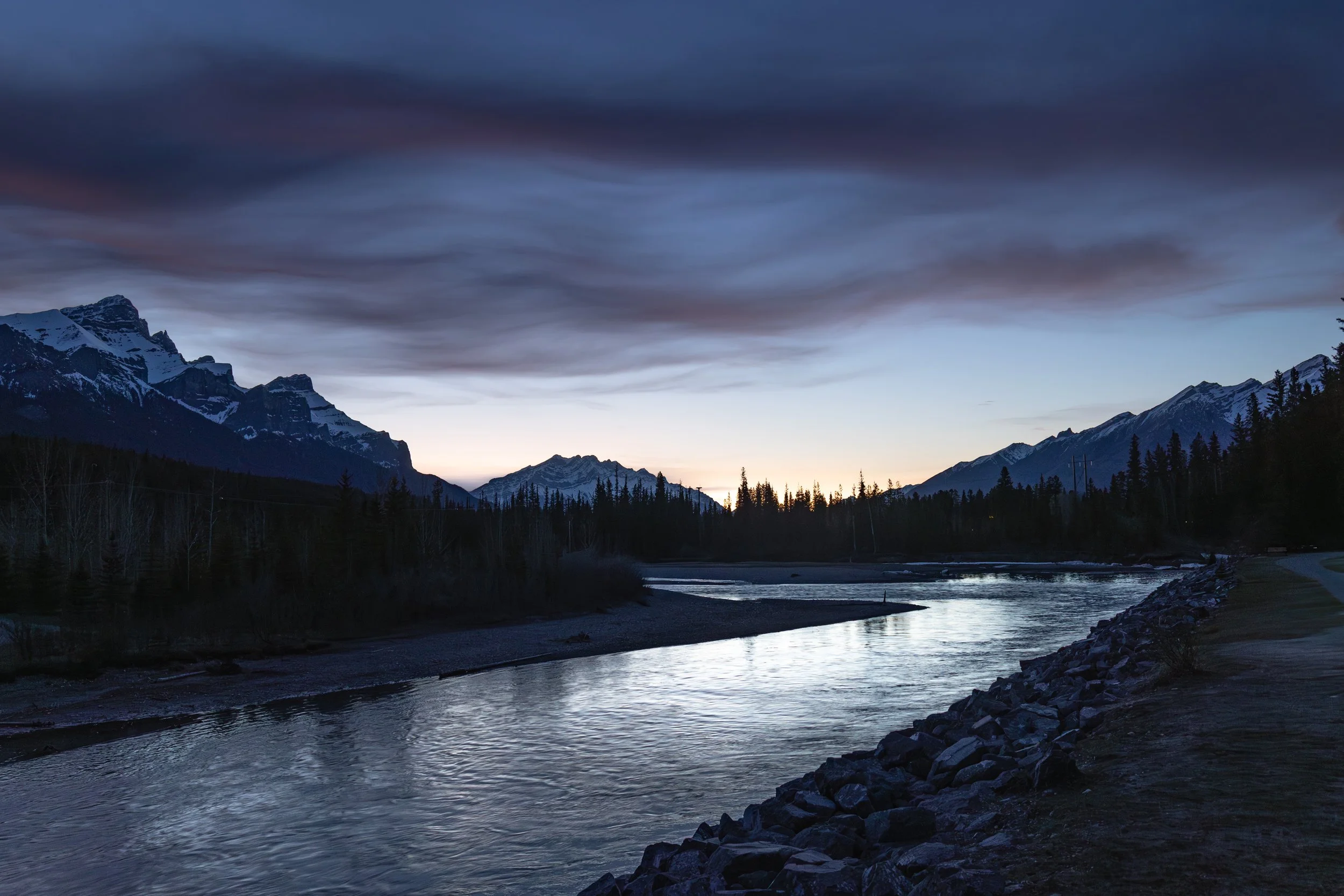 Canmore, a vibrant mountain town in Alberta, Canada. Canmore is nestled in the heart of the Bow River Valley and flanked by peaks on all sides. This sunset scene is captured from at the Canmore Engine Bridge.