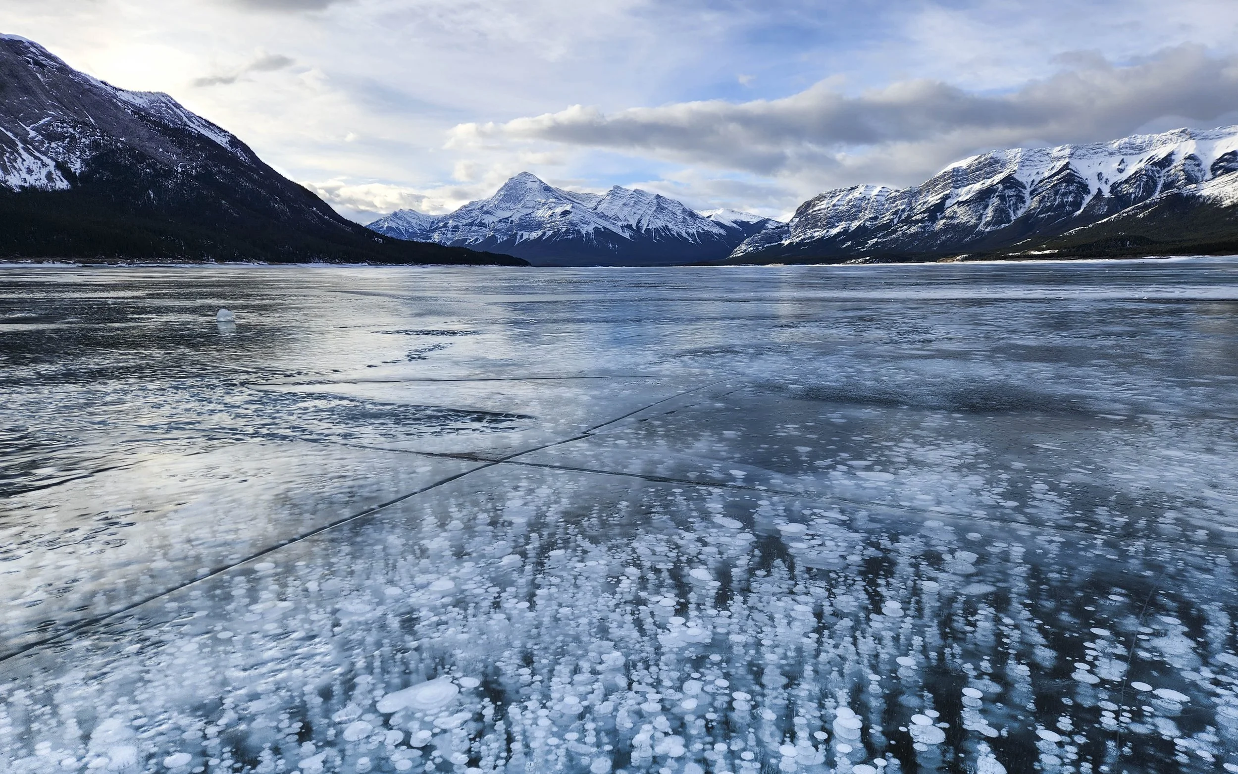 Abraham Lake is stunning in every season, but it truly dazzles in the winter when its blue waters trap thousands of white bubbles below the surface. During my second trip to capture images of the frozen methane bubbles, I geared up with the warmest winter wear and ice cleats, braving the cold (-6C or 20F) but thankfully with the wind dying down, making it bearable.