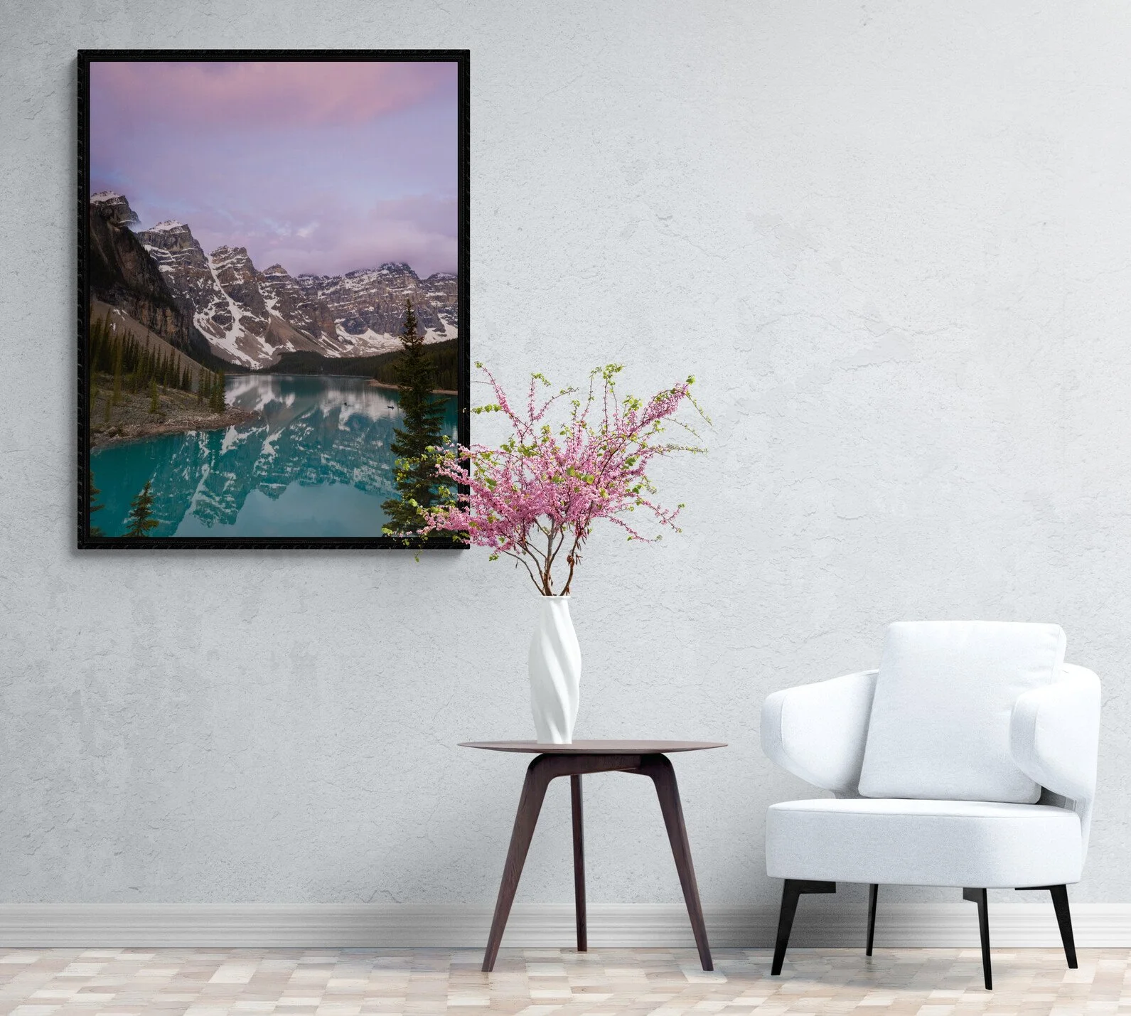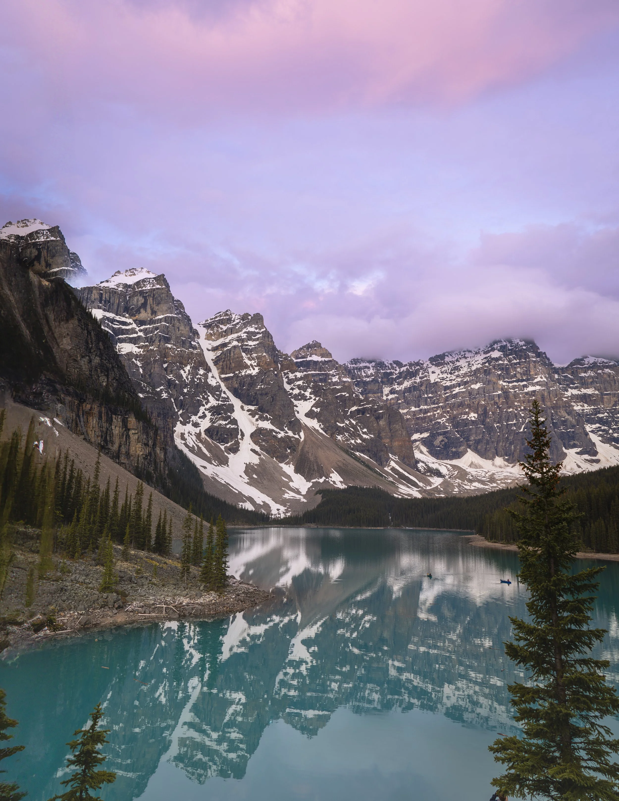 There is no place more iconic in the Canadian Rockies, or in Canada, than Moraine Lake. The alpine lake boasts a wild turquoise blue color, fed by glacier melt and set against the backdrop of the Ten Peaks. It is challenging to find a place more majestic and awe-inspiring than Moraine Lake. The scenery is truly astounding, and the tranquility of the location envelops you. The image captured here at sunrise will stay with you for a lifetime. I climbed up the rugged hill of stones to reach this viewpoint, which was bustling with photographers trying to capture the essence of this iconic lake. As snow started to descend, the atmosphere became truly magical. The experience of standing on top of the world to create this image is one I will never forget.
