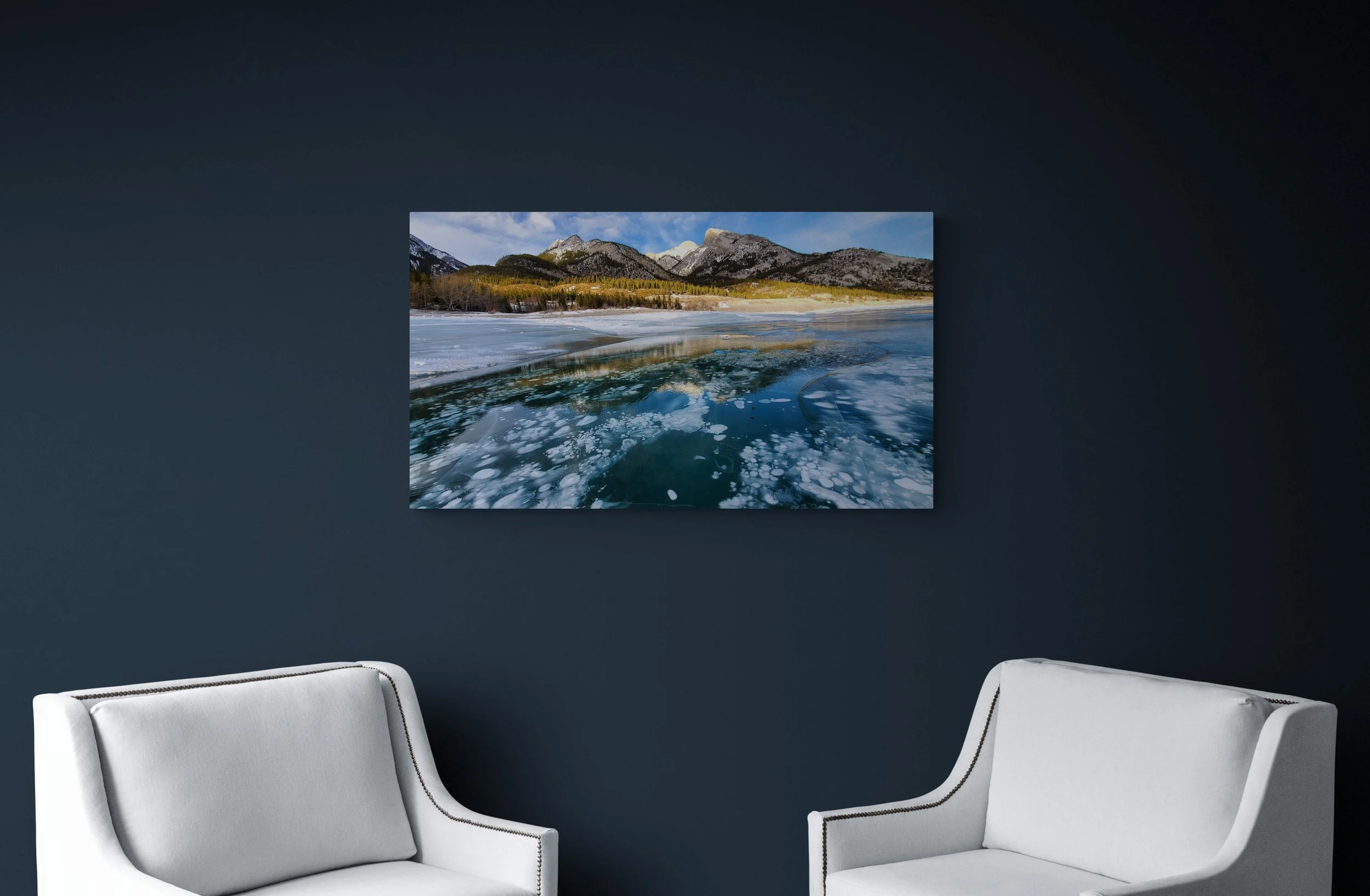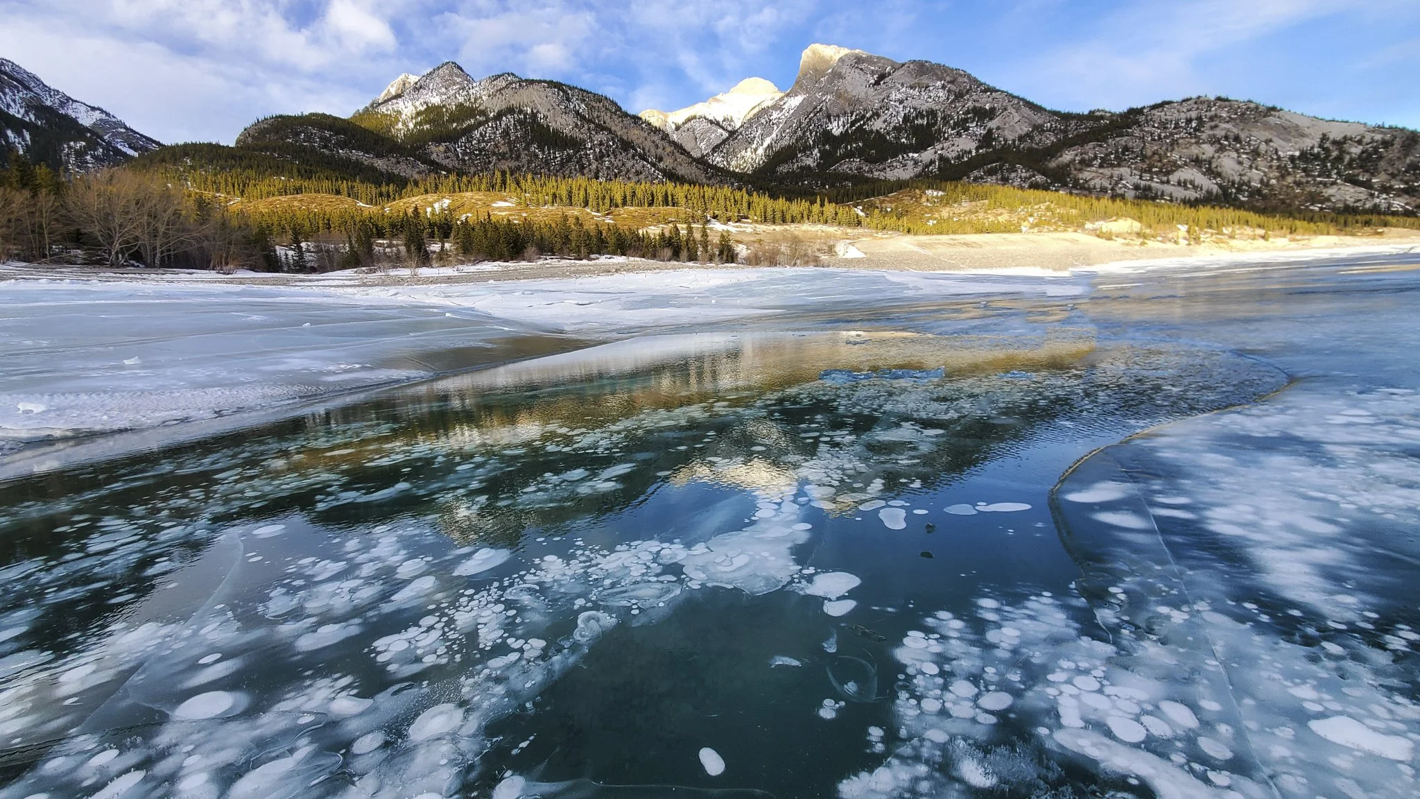 It has been an unusually warm winter. Although it was in the middle of January, some parts along the shore had thawed enough to cause puddles, thus exposing some bubbles. The mountains and pine trees along the shore provided a beautiful backdrop for my image, with the puddles in the foreground. The wind had died down for a few minutes, allowing a still reflection of the backdrop in the water. I was thankful for nature's cooperation in capturing this moment.