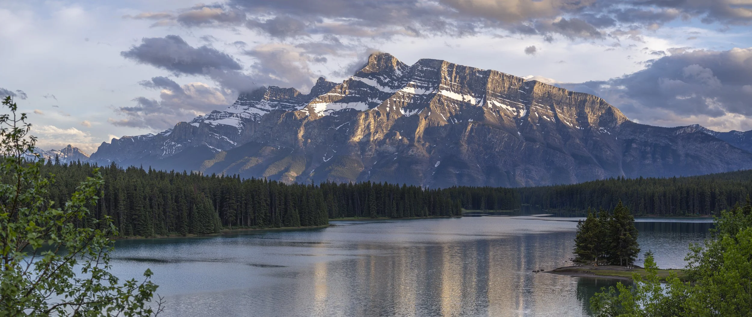 Two Jack Lake is a picturesque emerald green lake, in Banff National Park. Across the lake, the iconic summit of Mount Rundle rises serenely above it all. During the evening golden hour, visitors can witness the setting sun illuminating the tips of Mount Rundle.