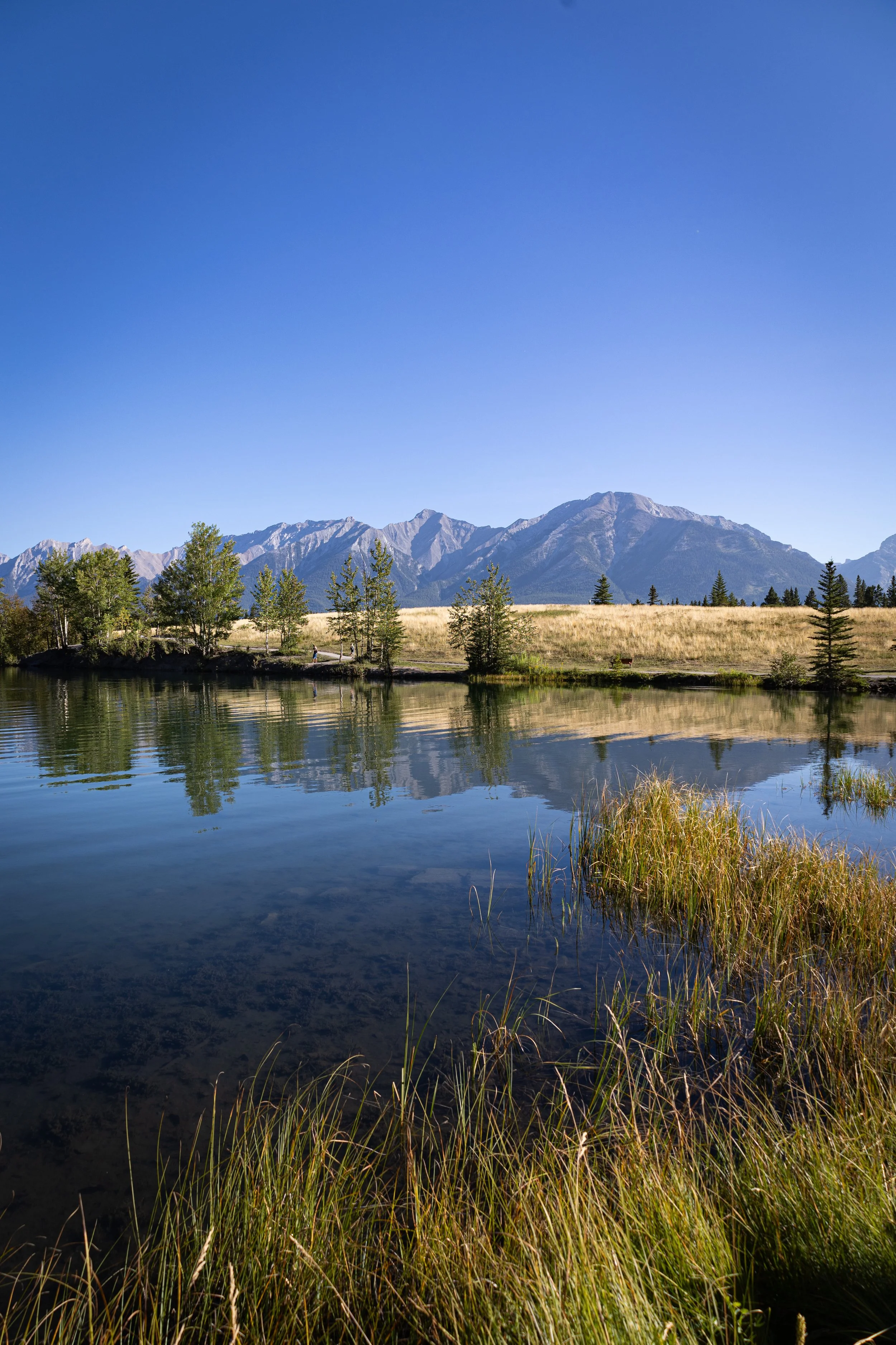 It was early in the morning, the sun was high in the sky, and the still air created perfect, crystal-clear reflections in the water. I was with a friend who wanted to explore some of the hidden gems of the Rockies, and we were rewarded with stunning sights and pristine reflections. This is Canmore, a charming town and the gateway to the Canadian Rockies.
