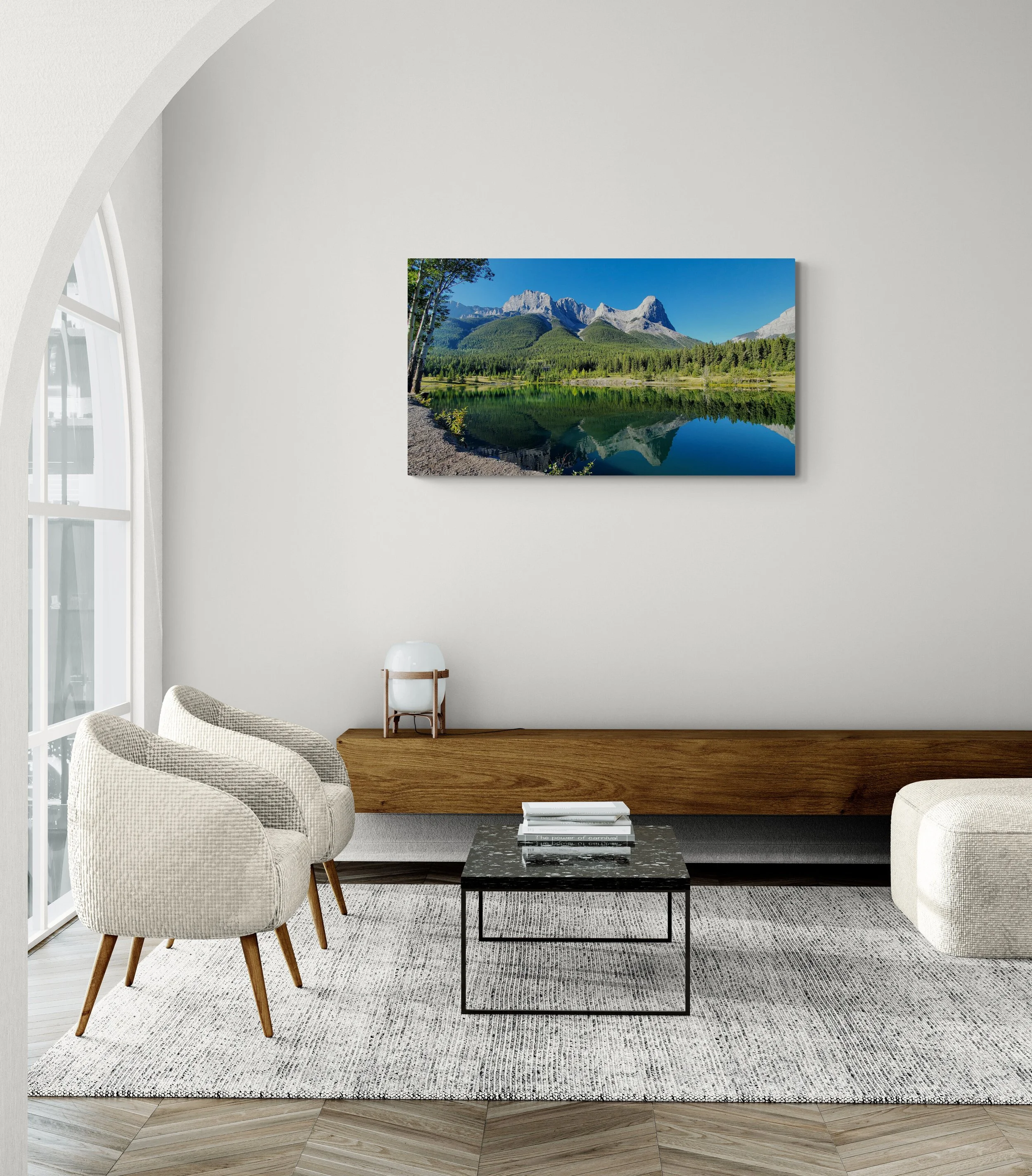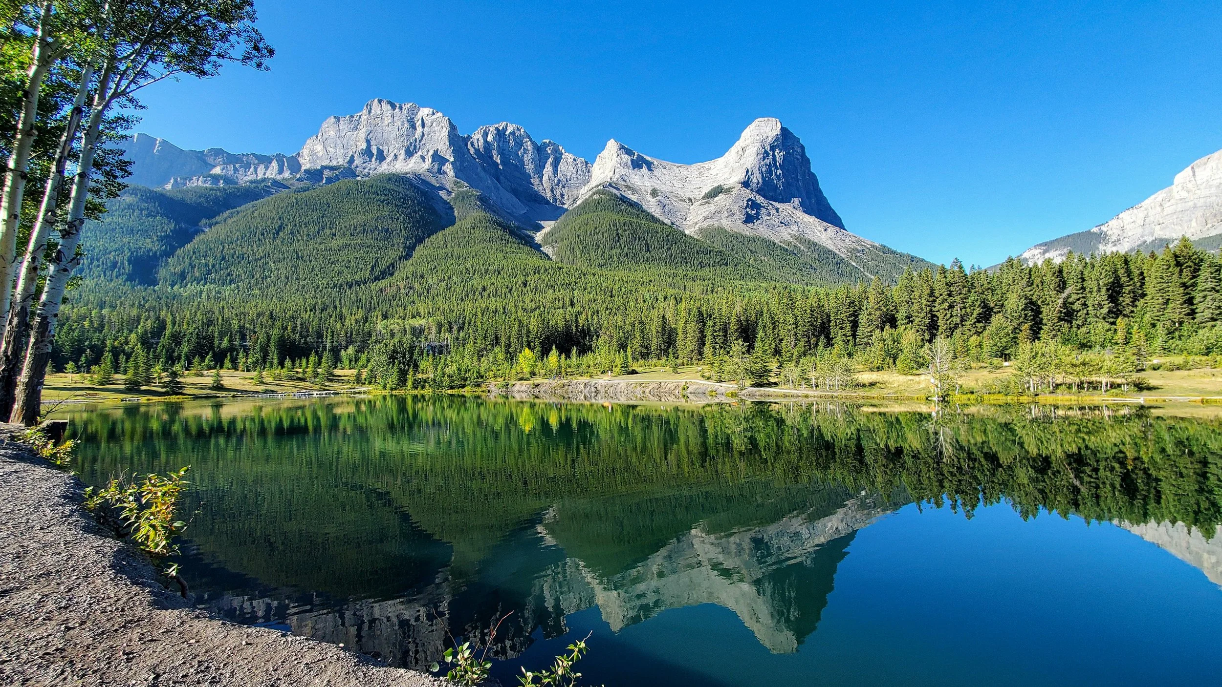 It was early in the morning, the sun was high in the sky, and the still air created perfect, crystal-clear reflections in the water. I was with a friend who wanted to explore some of the hidden gems of the Rockies, and we were rewarded with stunning sights and pristine reflections. This is Canmore, a charming town and the gateway to the Canadian Rockies.