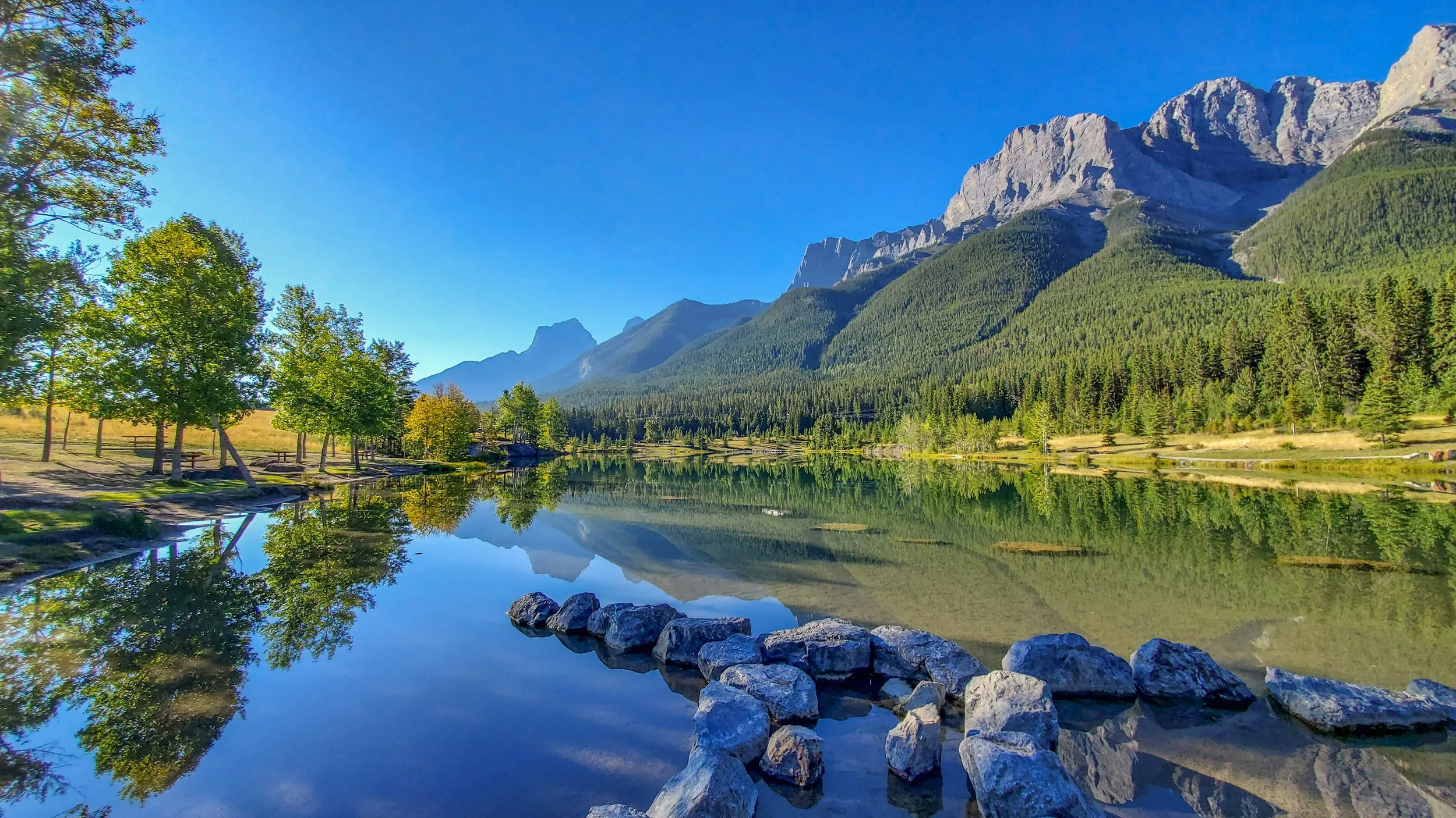 It was early in the morning, the sun was high in the sky, and the still air created perfect, crystal-clear reflections in the water. I was with a friend who wanted to explore some of the hidden gems of the Rockies, and we were rewarded with stunning sights and pristine reflections. This is Canmore, a charming town and the gateway to the Canadian Rockies.